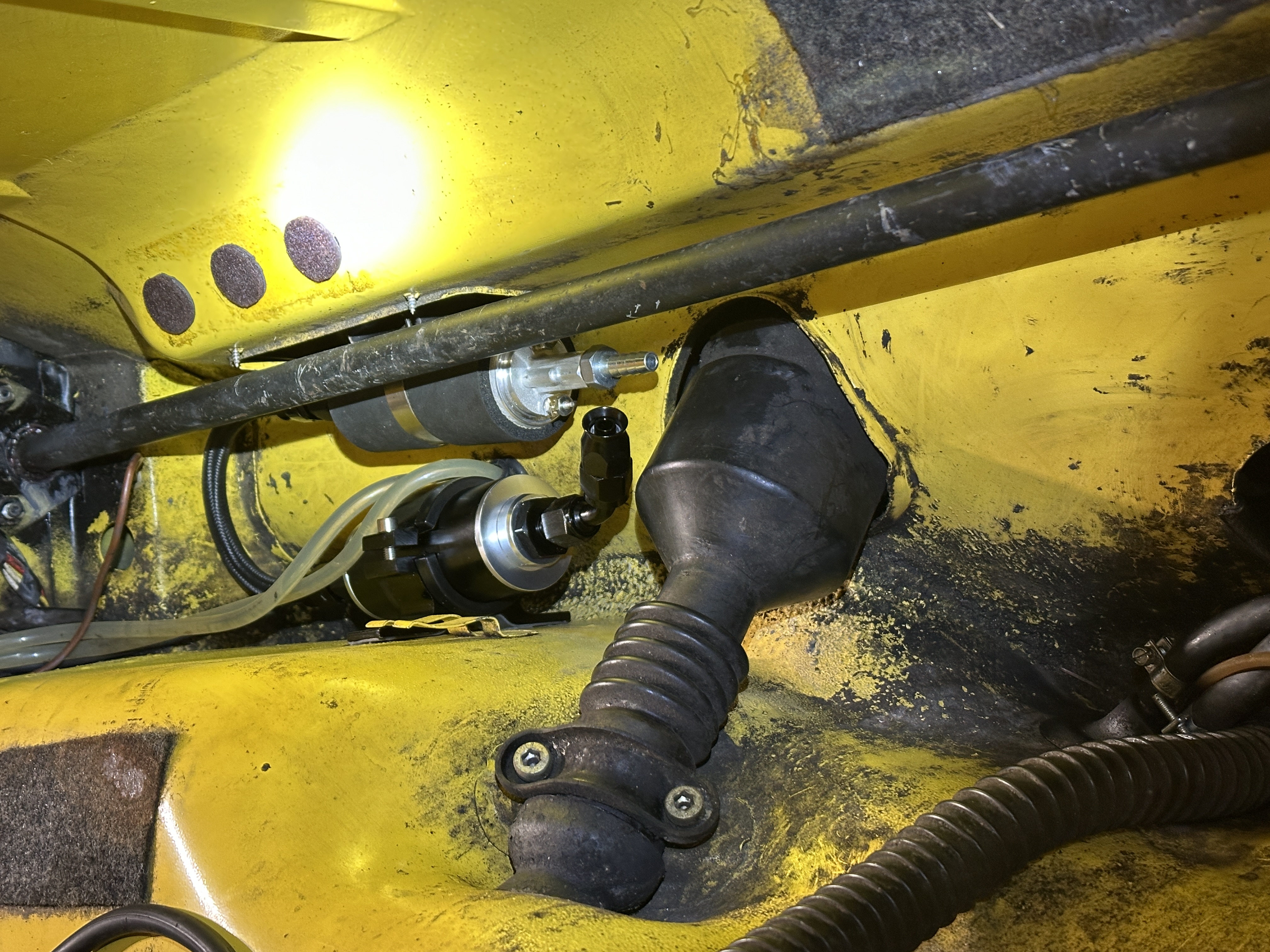For summary, The 75 now has a 100 micron pre filter into a Walbro pump and 6 AN PTFE braided lines and a new tank. A spin on 6-8 micron filter in the engine compartment for EZ service, located by the fresh air inlet so temp should not be an issue