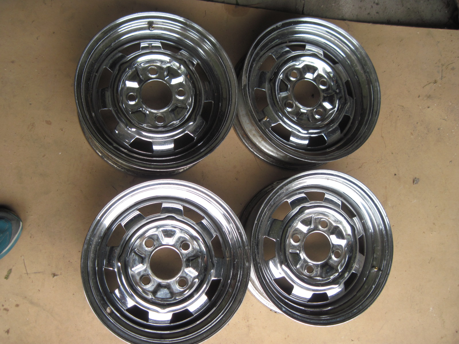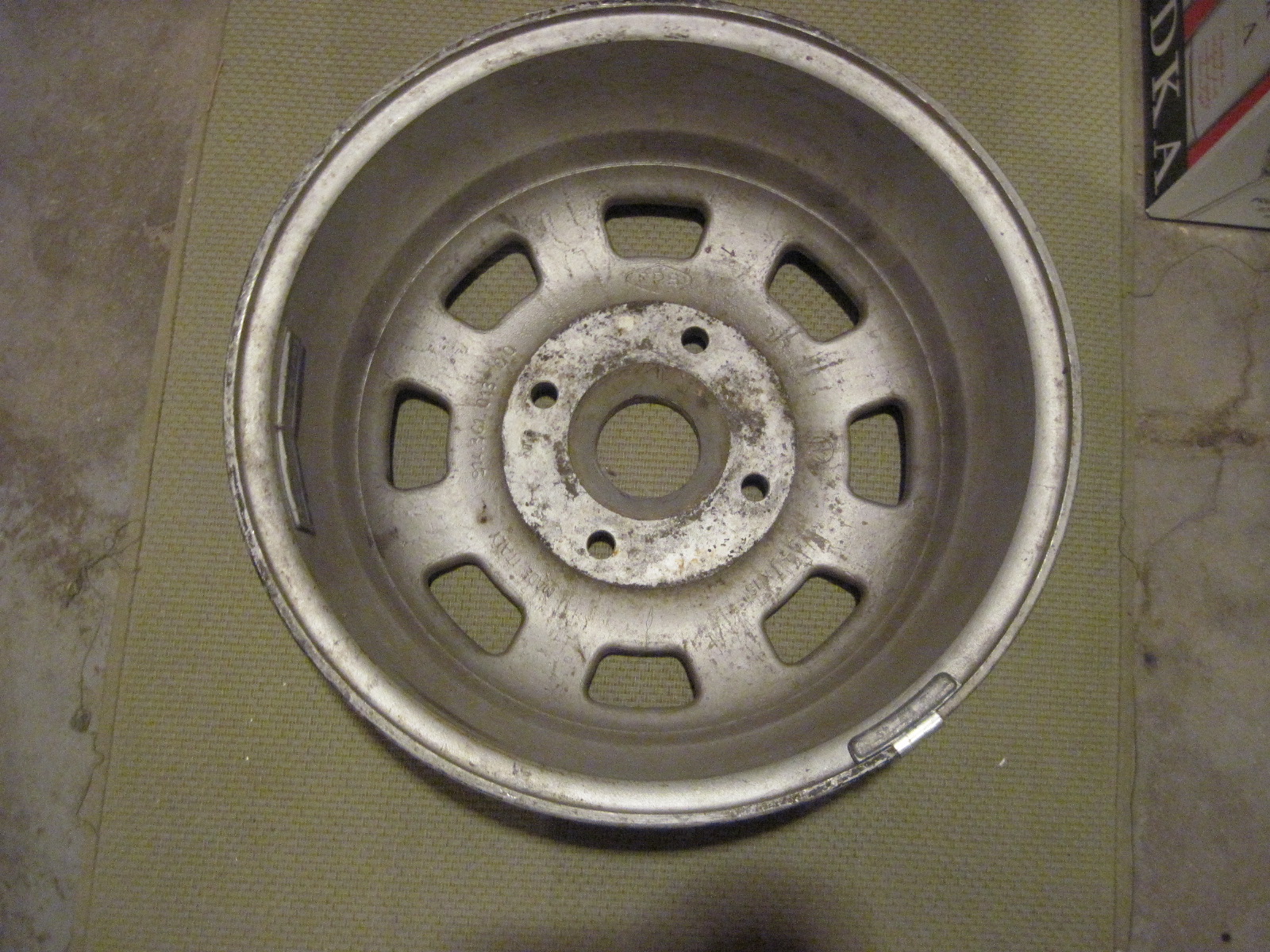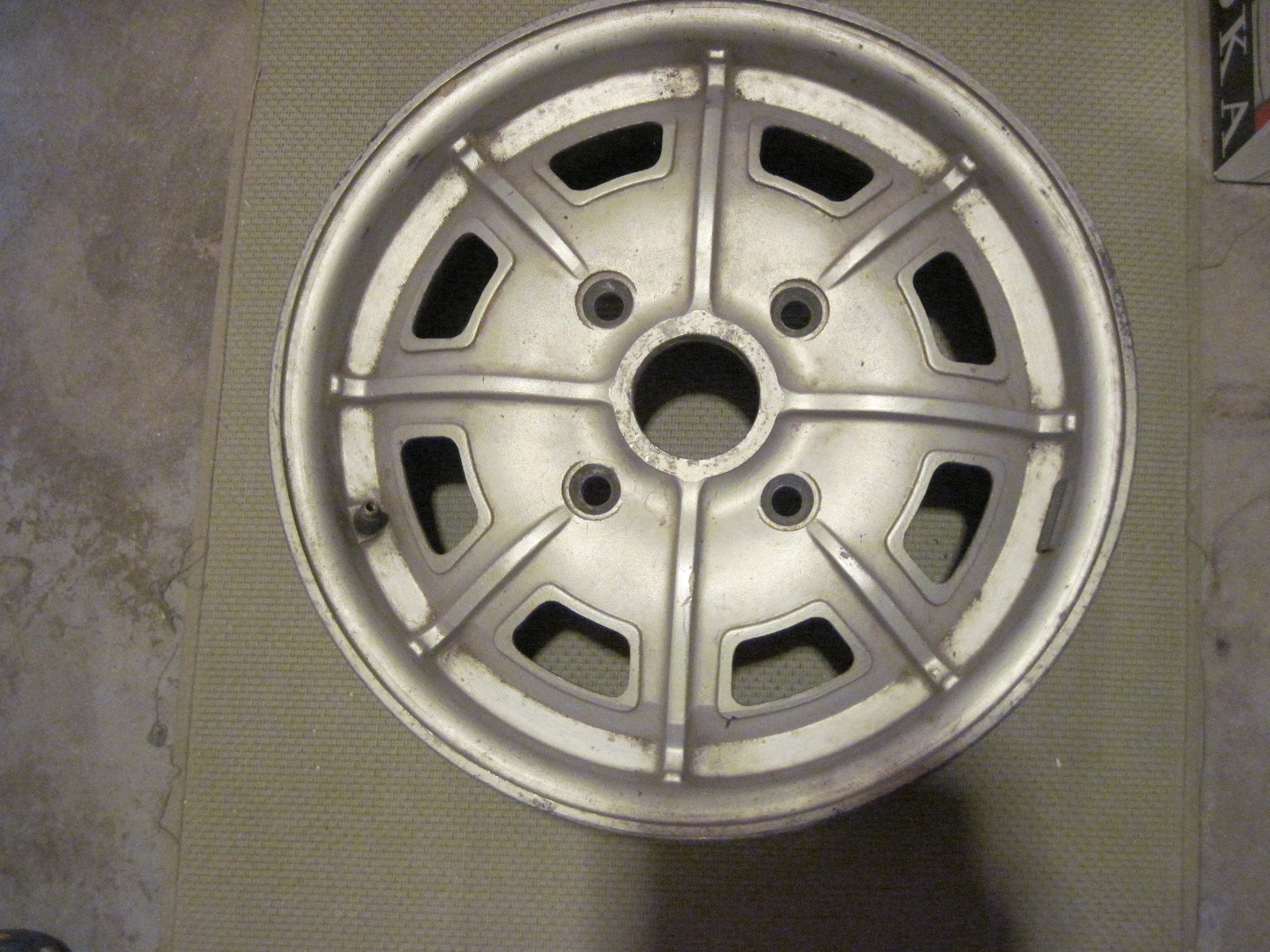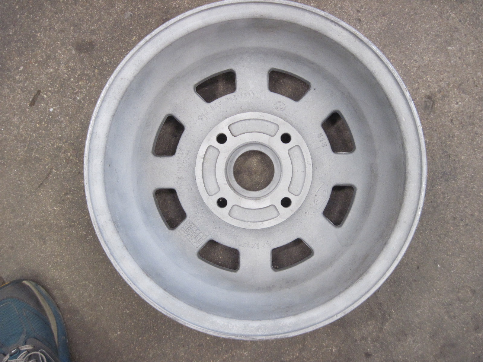 Stock Fuchs alloy wheel and original Dunlop tire. Definitely has a ding. Could be used as a spare tire (short distance on a 50+ year tire. $100 Predini original wheel, late style that can be used on any 914/4 hub. Refinished and absolutely straight. $125. Predini early original wheel. This is the early style which can only be used on 1970-1971 and early 1972 with original rotors. Absolutely straight, $100. I have 2 of these. 5.5X15 chrome wheels, nice condition for all 914/4. $125 set of 4. Plus shipping. Check or PayPal with a 4% add on. Attached thumbnail(s) |