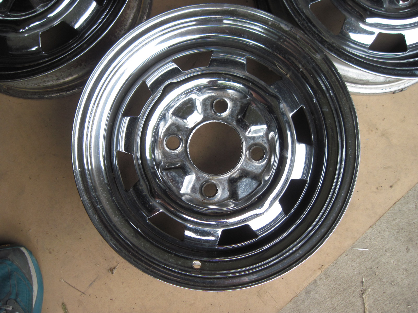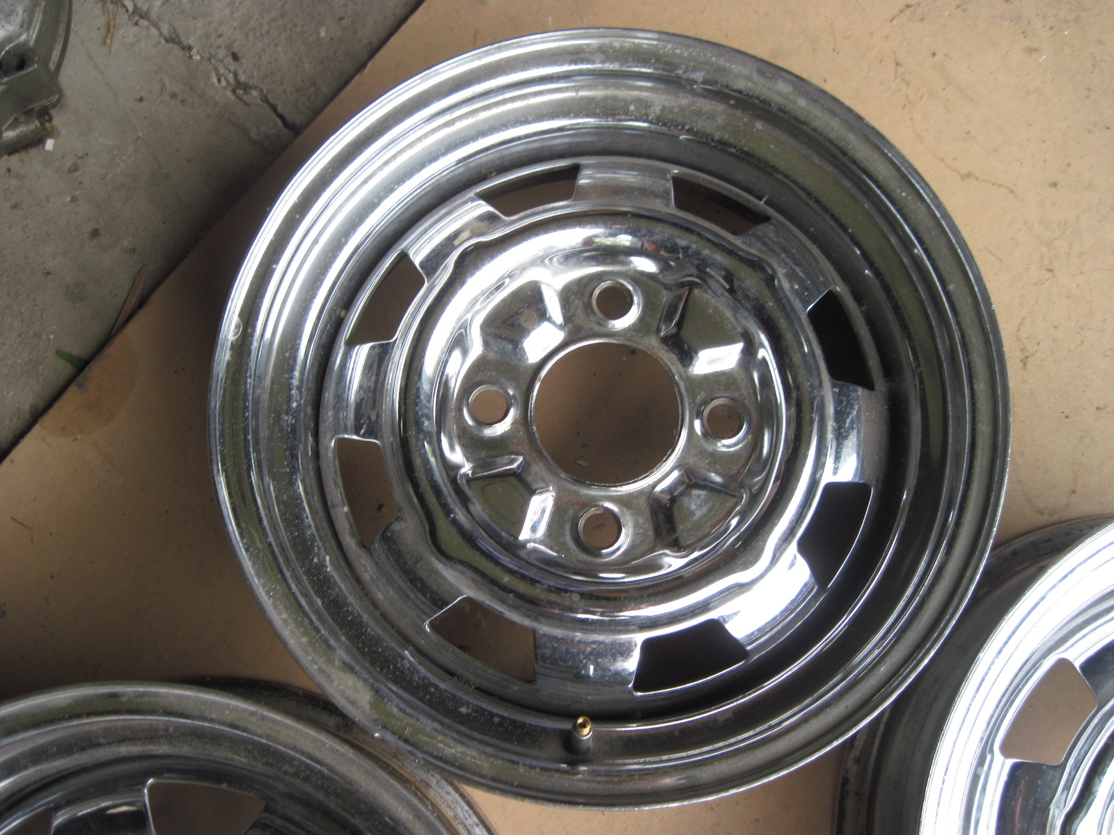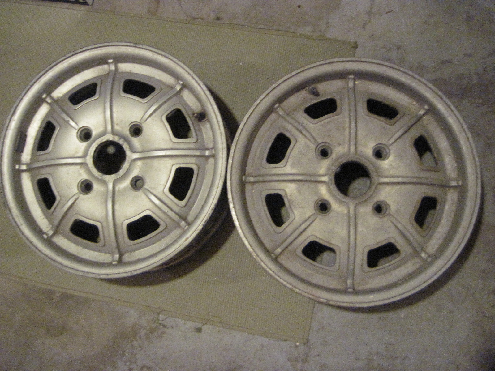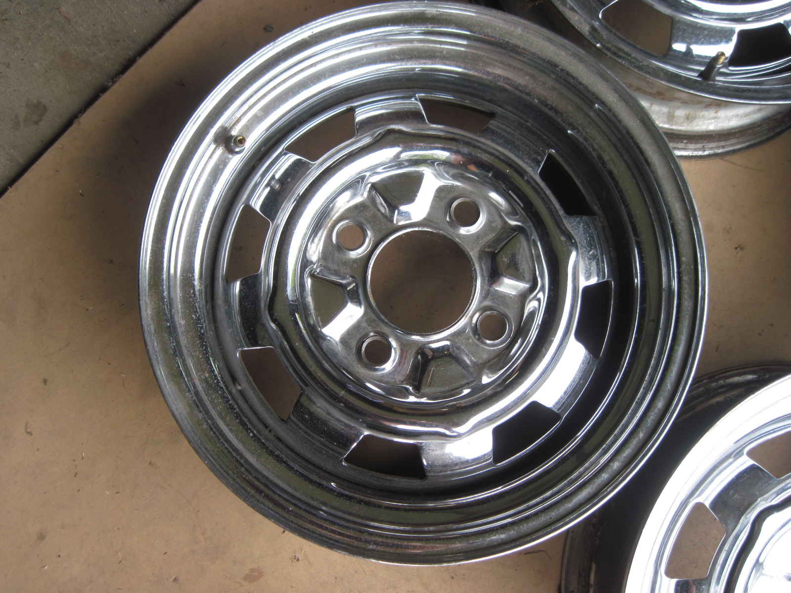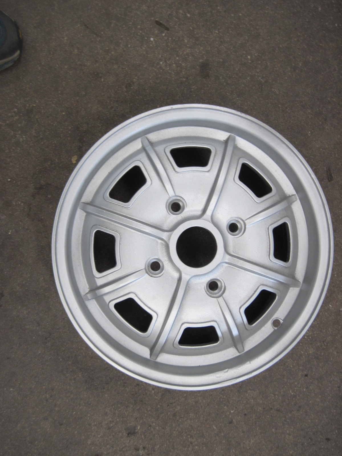 Stock Fuchs alloy wheel and original Dunlop tire. Definitely has a ding. Could be used as a spare tire (short distance on a 50+ year tire. $100 Predini original wheel, late style that can be used on any 914/4 hub. Refinished and absolutely straight. $125. Predini early original wheel. This is the early style which can only be used on 1970-1971 and early 1972 with original rotors. Absolutely straight, $100. I have 2 of these. 5.5X15 chrome wheels, nice condition for all 914/4. $125 set of 4. Plus shipping. Check or PayPal with a 4% add on. Attached thumbnail(s) |