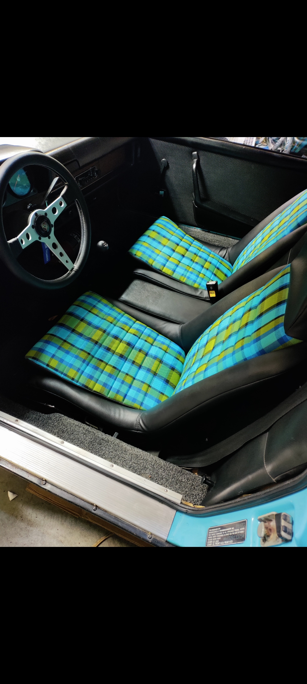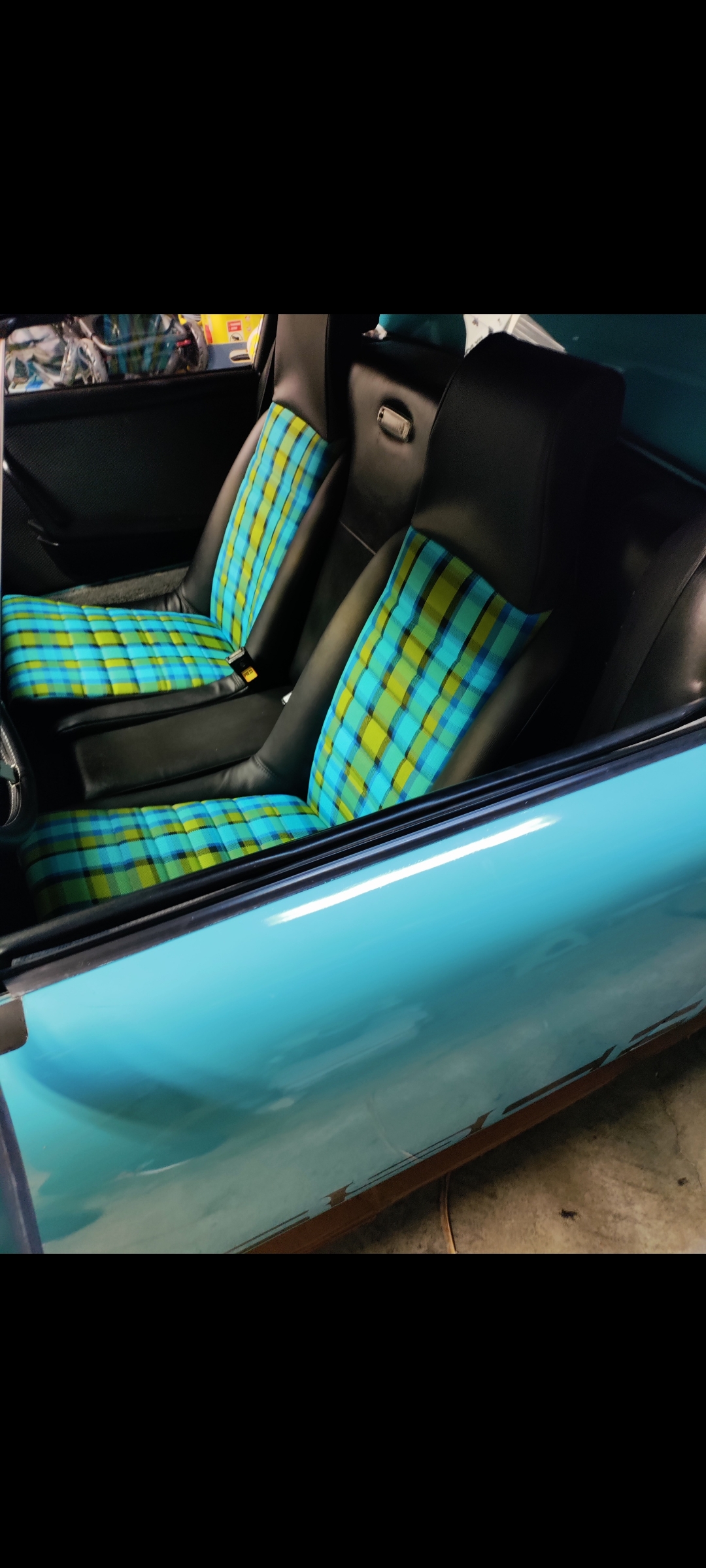 I have always wanted plaid or tartan seats in my '73, even though they weren't offered until '75-'76. So my buddy and I went a little rogue and added a Westfalia (inspired)Blue/Green Plaid! I think it pairs nicely with the Olympic Blue exterior and adds some character. Next will be to add the same material to the dash face.