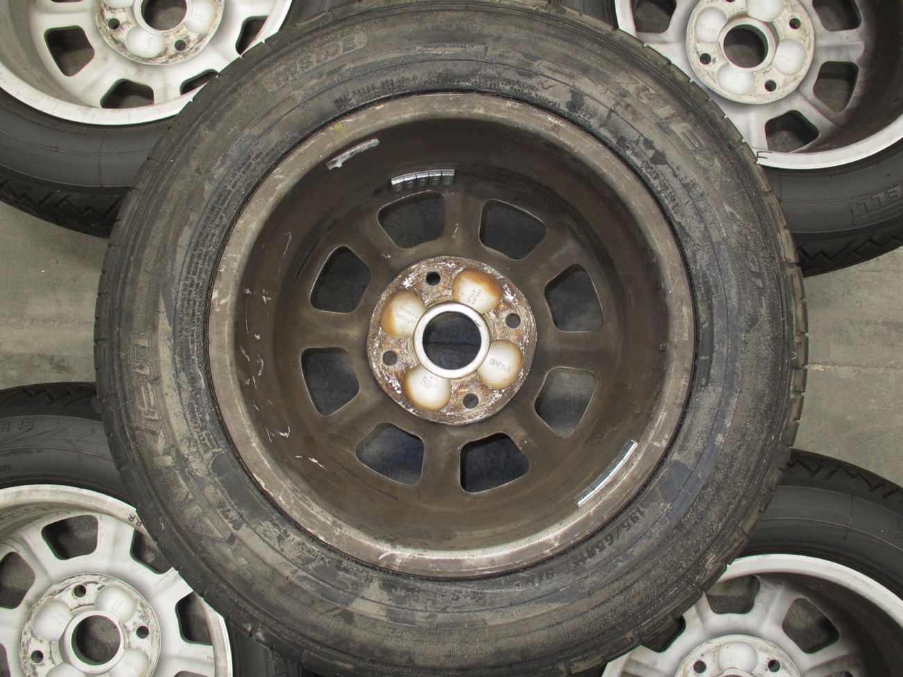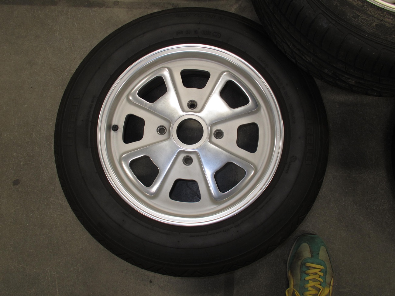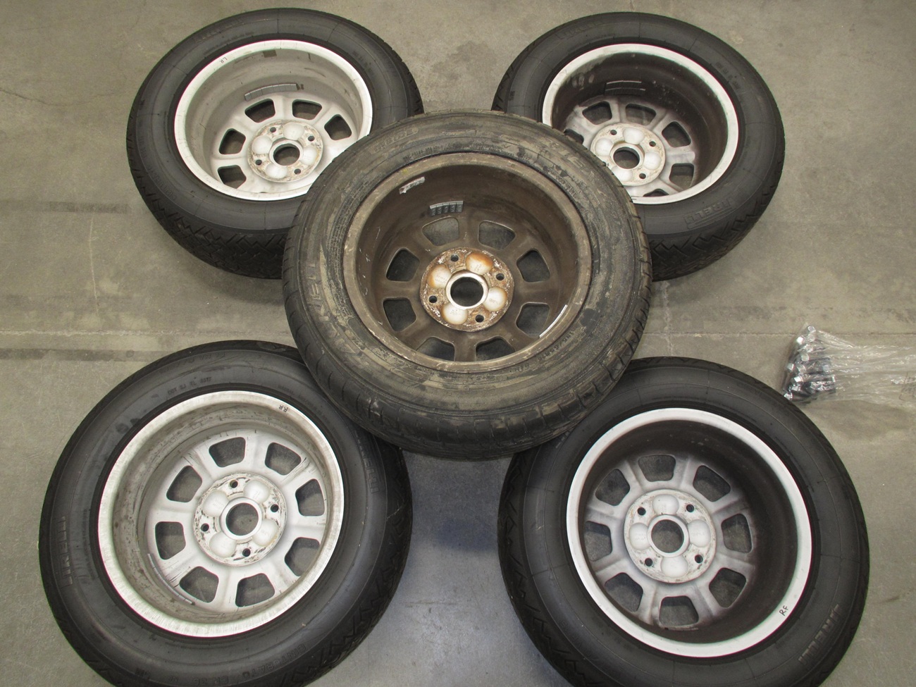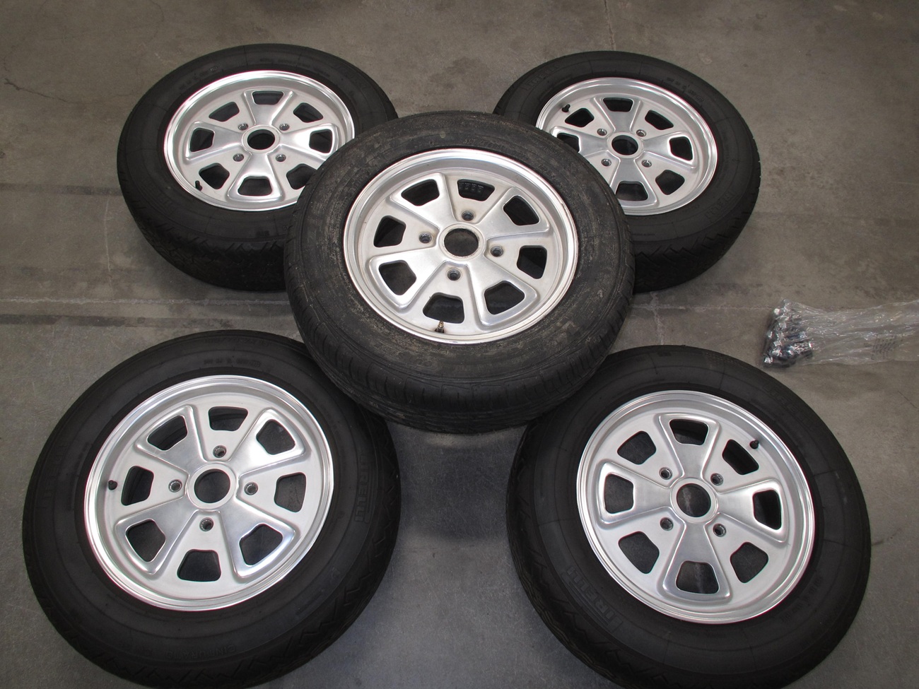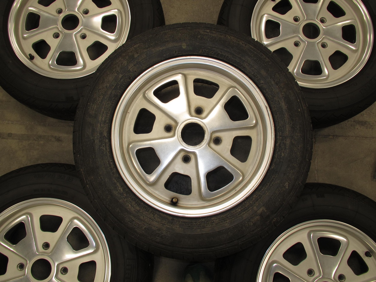 These tires were the best back in the day before the P7 came out. So this package is very "period correct" for early to mid 70's Porsche. Four wheels were restored in SoCal a few years ago and have about 2K miles on them. The tires are Pirelli CN36 185/70VR15. I'm not sure of the exact tire age but they are soft and have no cracks. The tires were $300+ each when new. The wheel in the center is unrestored and has a new Falken tire that has the molding nubs still. This was in the trunk, and it has leached some wax from the manufacturing process over the years. This is the crusty stuff shown in the photos. Included is a full set of chromed lug bolts. I guess I can ship them, but I would have to band 2 pairs together and have one single? I can do the banding like that used with pallets, but the new owner needs to figure out the shipper logistics. They are in my company shop "DriveLabs" in Foothill Ranch 92610. Now that I think of it, I can probably bind all five wheels together on a pallet as I have a forklift here. $1200 Thanks for looking, Paul VDL Attached thumbnail(s) |