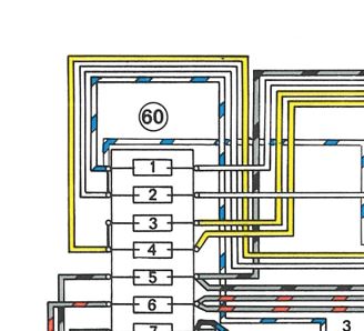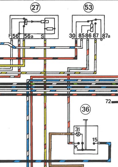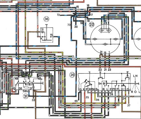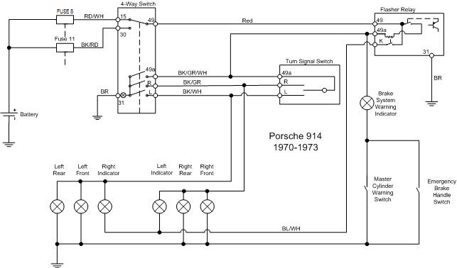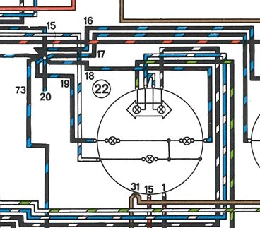 I've traced the flow of current from the fuse panel (red with white stripe) to the hazard switch, from there (red) to the relay and from there to the turn signal indicators (blue with white stripe).
